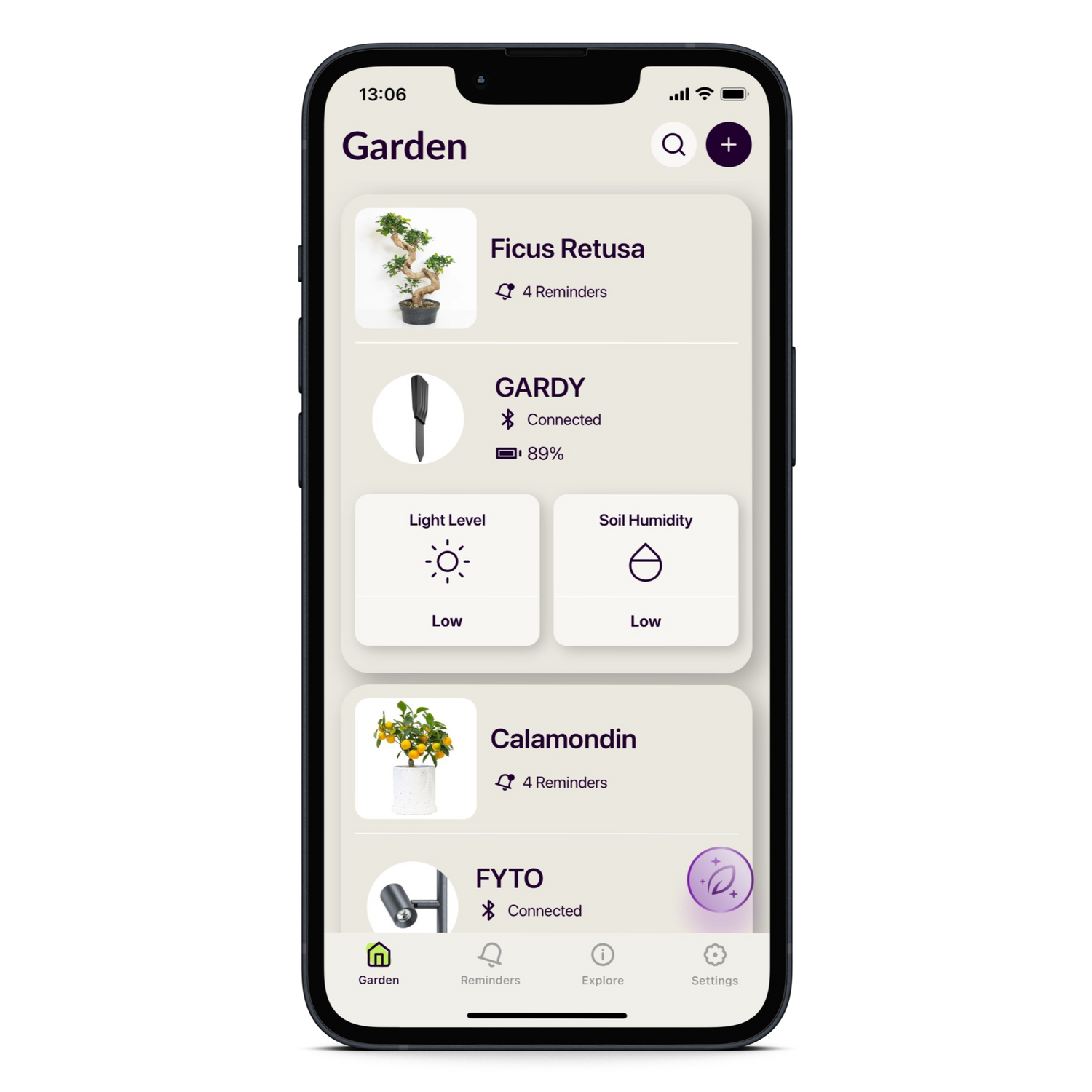 FYTO Smart integrates seamlessly with your smartphone via the Planteia App. Customize your experience by pairing FYTO Smart with specific plant species or selecting a plant group mode. Adjust settings, choose your preferred lighting regime, and stay informed with updates on vital plant factors. The app also provides expert care tips, intelligent notifications, and helpful reminders, ensuring your plants stay healthy and thriving effortlessly.